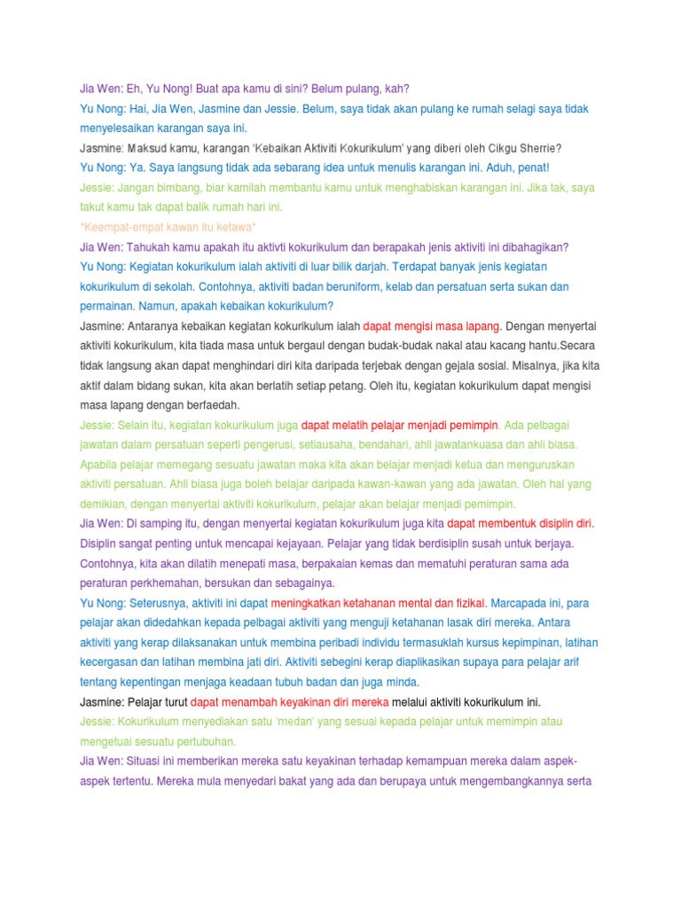 Tegasnya , faedah menyertai aktiviti kokurikulum di sekolah adalah dapat meningkatkan keyakinan diri. 14 contoh karangan narasi tentang pendidikan, liburan, lingkungan, guru, sekolah juga pengalaman pribadi adalah karangan yang cerita untuk pembahasan kali ini kami akan memberikan ulasan mengenai contoh karangan narasi yang dimana dalam hal ini meliputi contoh tentang. Kokurikulum ialah aktiviti di luar kelas. Contoh karangan faedah bersukan setiap pelajar diwajibkan menyertai aktiviti sukan di sekolah. Semua pelajar digalakkan menyertai kegiatan kokurikulum mendatangkan banyak faedah.