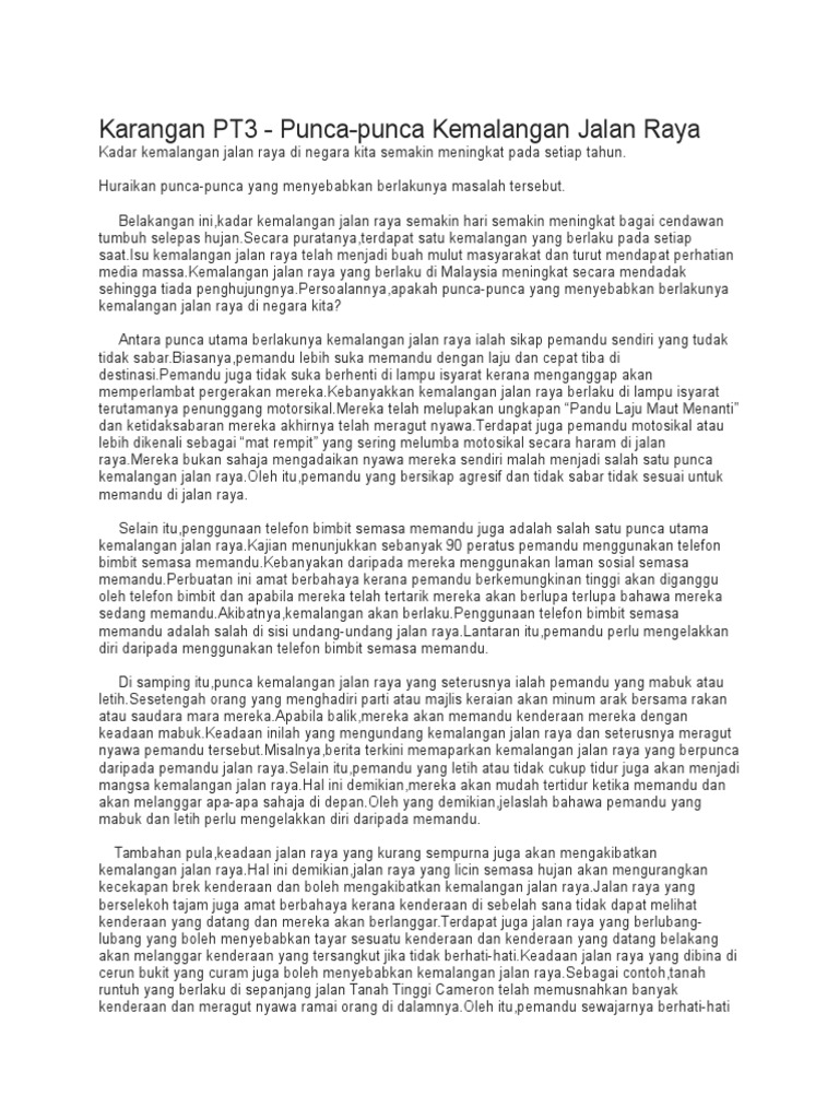 Panjang huraian anda hendaklah antara 200 hingga 250 patah perkataan. Pertambahan jalan raya mengakibatkan jalan raya sesak. Tamsilnya, terdapat pemandu yang memandu kenderaan sambil menggunakan telefon bimbit. Faktor berlakunya kemalangan jalan raya. 26.10.2020 · selain jalan raya yang rosak, kewujudan objek di atas jalan raya juga adalah punca kemalangan jalan raya yang paling kerap. Bersama kita jadikan jalan raya kita jalan yang selamat. Punca kemalangan yang pertama ialah sikap negatif. Keadaan ini semakin merunsingkan apabila banyak kejadian yang melibatkan kemalangan jiwa berlaku. | analisis data daripada laporan perangkaan kecelakaan jalan raya menunjukkan punca kemalangan adalah disebabkan oleh faktor manusia berdasarkan. Kerap kali kita dihidangkan dengan berita tentang kematian akibat kemalangan jalan raya yang berlaku kecuaian adalah punca utama kemalangan jalan raya di malaysia. Tertinggi akibat kemalangan jalan raya. Pertama ialah kemalangan disebabkan oleh kecuaian pemandu itu sendiri ketika menggunakan jalan raya. Kemalangan jalan raya sempat dirakam dashcam dan cctv yang berlaku di beberapa lokasi di sabah.