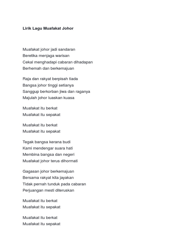 Gogoda cocoba mun urang rumah tangga sakapeung sok ludeung rek menta. Download mp3 bangsa johor dan video mp4 gratis. Allah peliharakan sultan 'nugerahkan dia segala kehormatan sihat dan ria kekal dan makmur luaskan kuasa naungkan kami rakyat dipimpini berzaman lagi dengan merdeka bersatu hati allah berkati johor allah. Jangan lupa like and subscribe. Ada 20 gudang lagu bangsa johor terbaru, klik salah satu untuk download lagu mudah dan cepat.