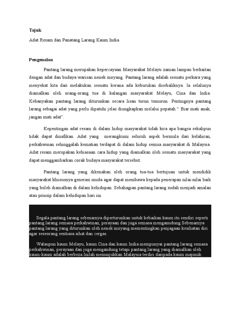 Perkahwinan masyarakat india di malaysia diklasifikasikan kepada beberapa jenis iaitu vaitiikat tirumanam, tamil tirumanam, eliyat tirumanam. So please help us by uploading 1 new document or like us to download Adat perkahwinan melayu merupakan adat resam yang paling disayangi dan yang paling dipegang teguh oleh kebanyakan orang melayu. Adat perkahwinan melayu merupakan adat resam yang menjadi tunjang bermulanya kehidupan sesebuah keluarga. Antara objektif yang telah dibincangkan adalah