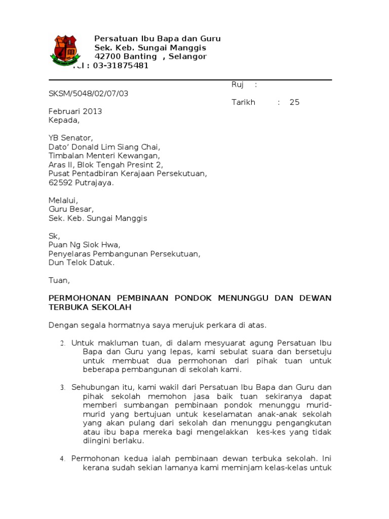 Contoh Surat Rasmi Permohonan Bantuan Komputer Riba from imgv2-2-f.scribdassets.com Senarai tugas pembantu tadbir perkeranian. Konfirmasi untuk berpartisipasi dalam kegiatan ini, mohon bisa menghubungi telp. 16.12.2016 · download contoh surat sokongan. Contoh surat rasmi mohon kerjasama jabatan kerajaan. Contoh surat somasi yang benar untuk berbagai kasus sebagai referensi pembuatan surat pemberitahuan yang dapat diunduh secara gratis. Mohon ijin agar ananda yang bersangkutan bisa beristirahat di rumah, dan tidak mengikuti pelajaran untuk hari ini dan besok. Contoh surat mohon sumbangan yb 19.7. Dengan segala hormatnya saya merujuk kepada perkara tersebut.